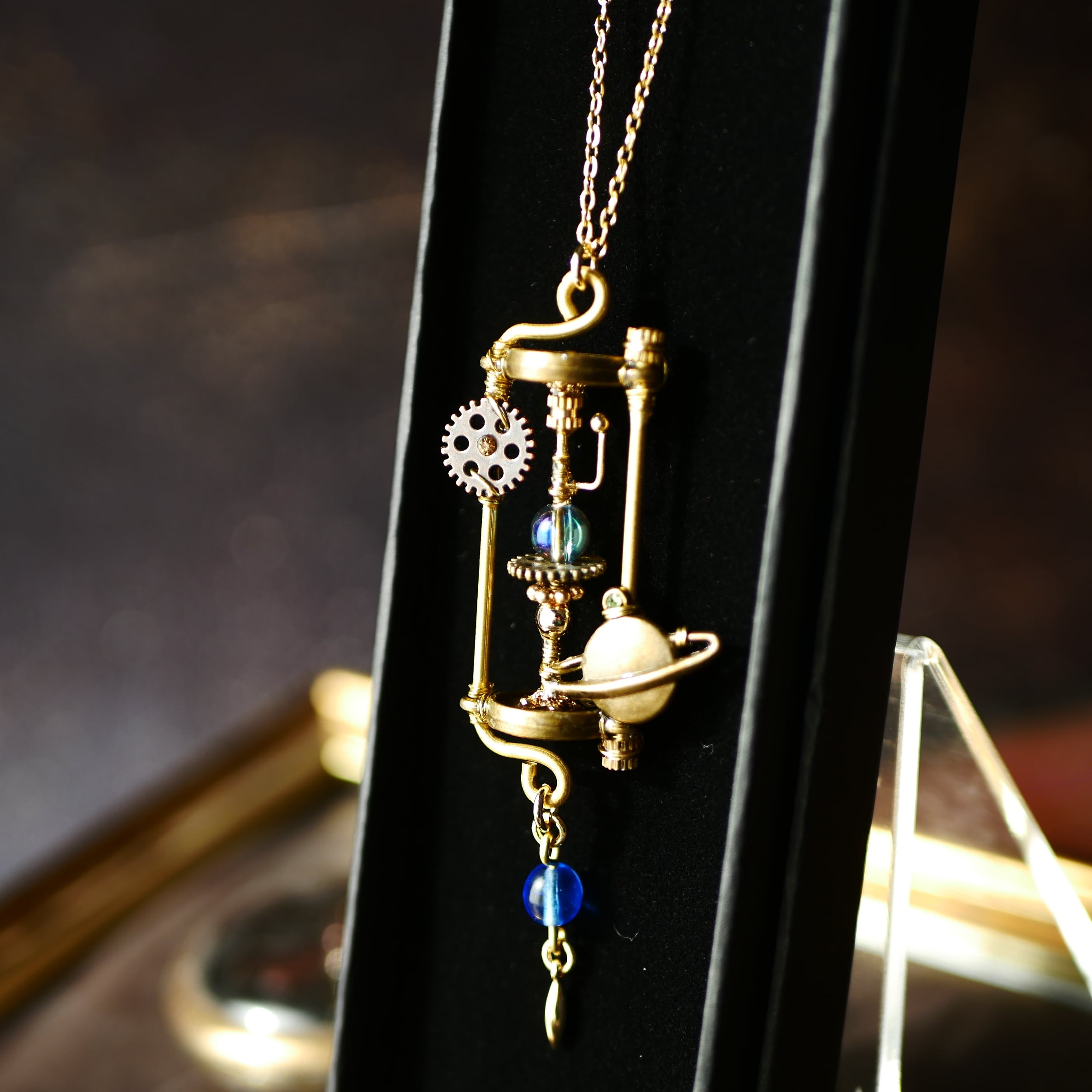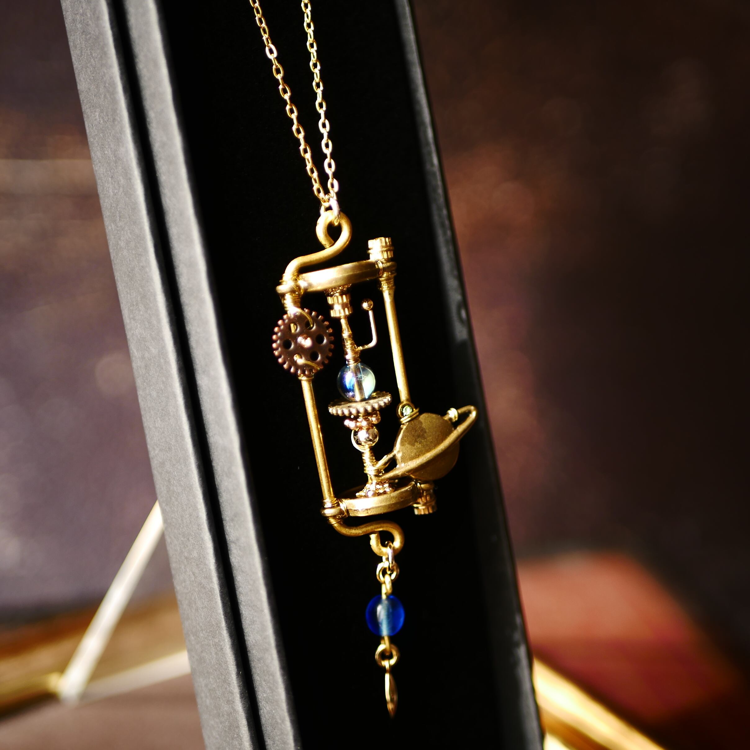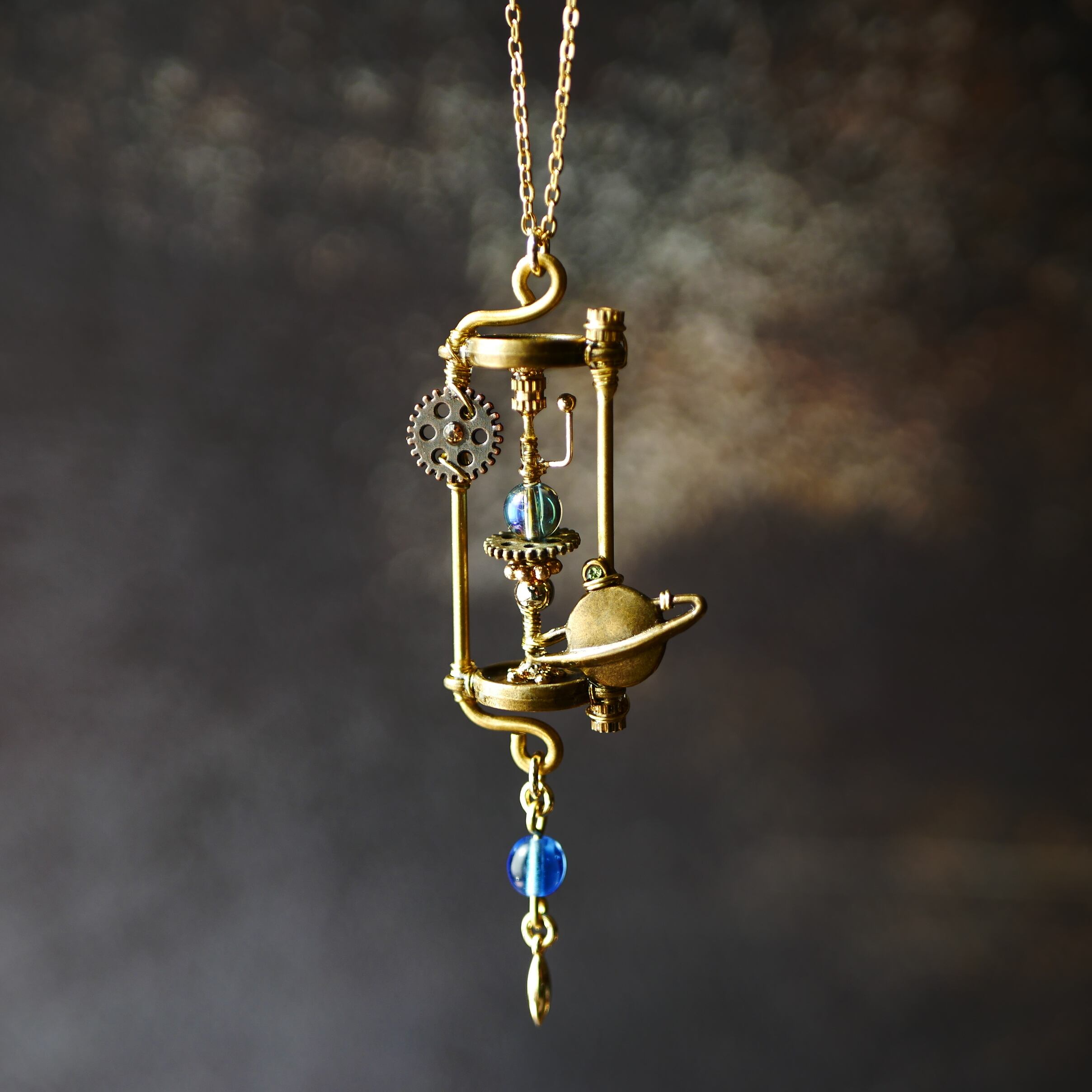 惑星と歯車のチャームを飾ったおもちゃのような宇宙をイメージしました。