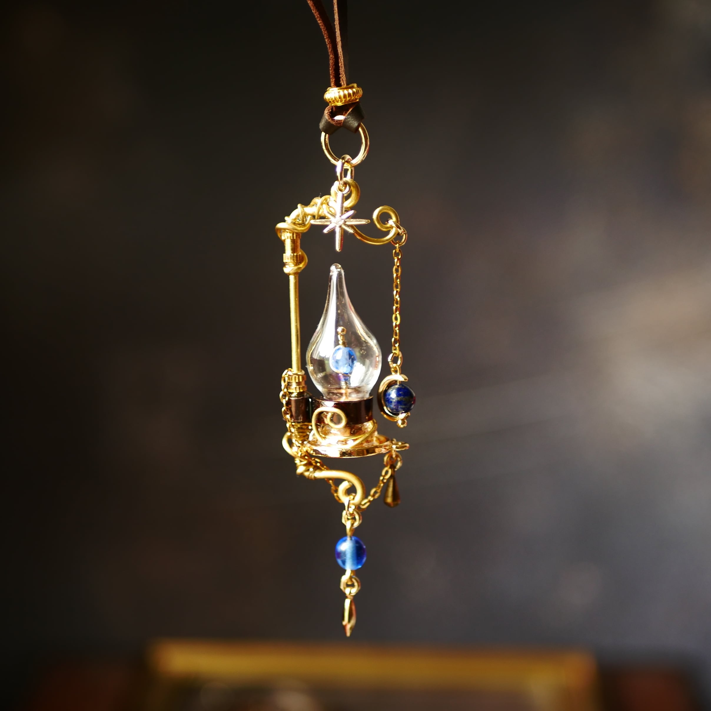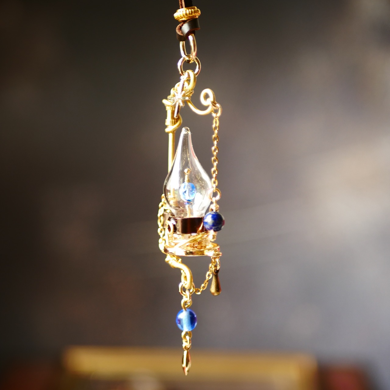 小さなガラスボトルにチェコガラスを閉じ込め、真鍮ワイヤーでデザインしています。