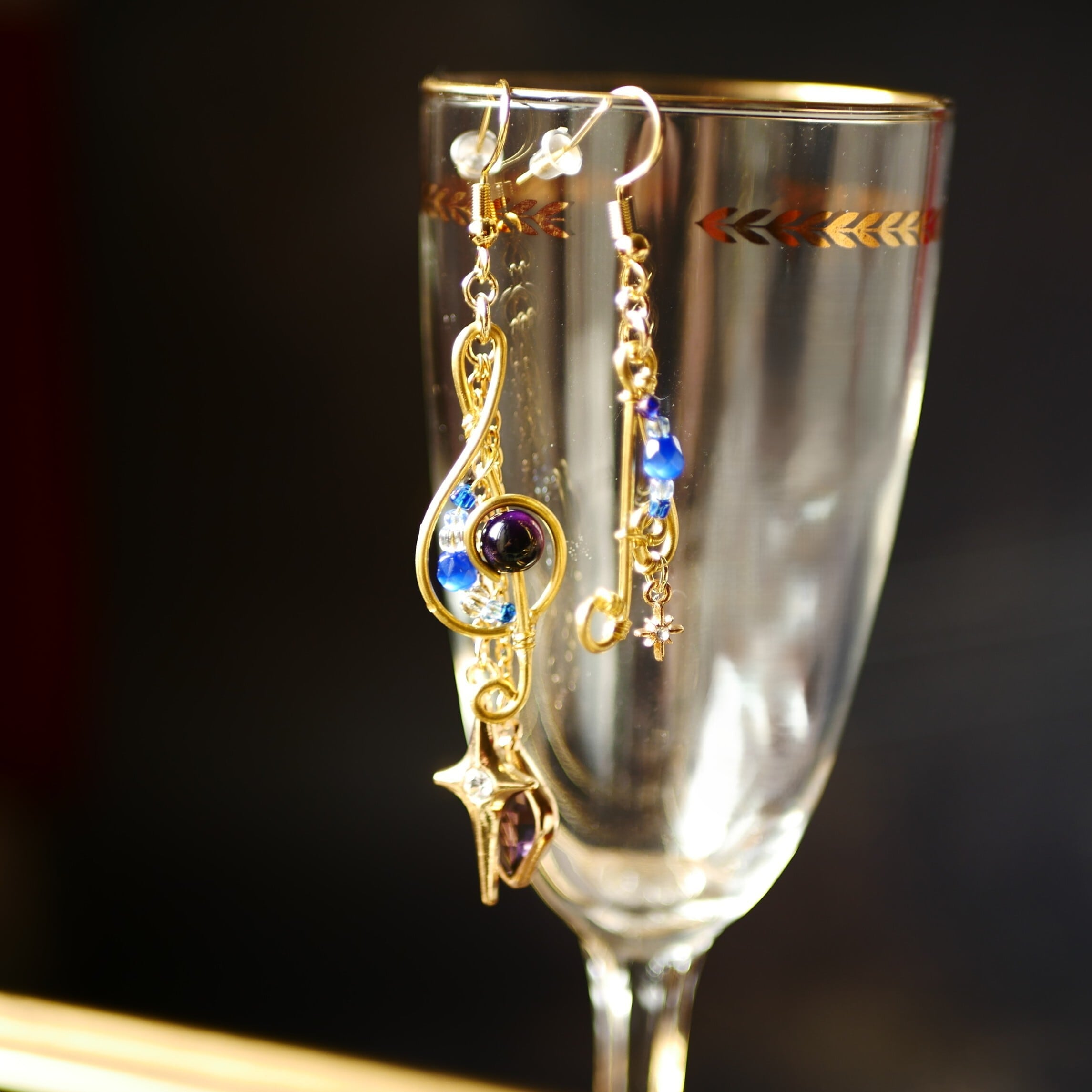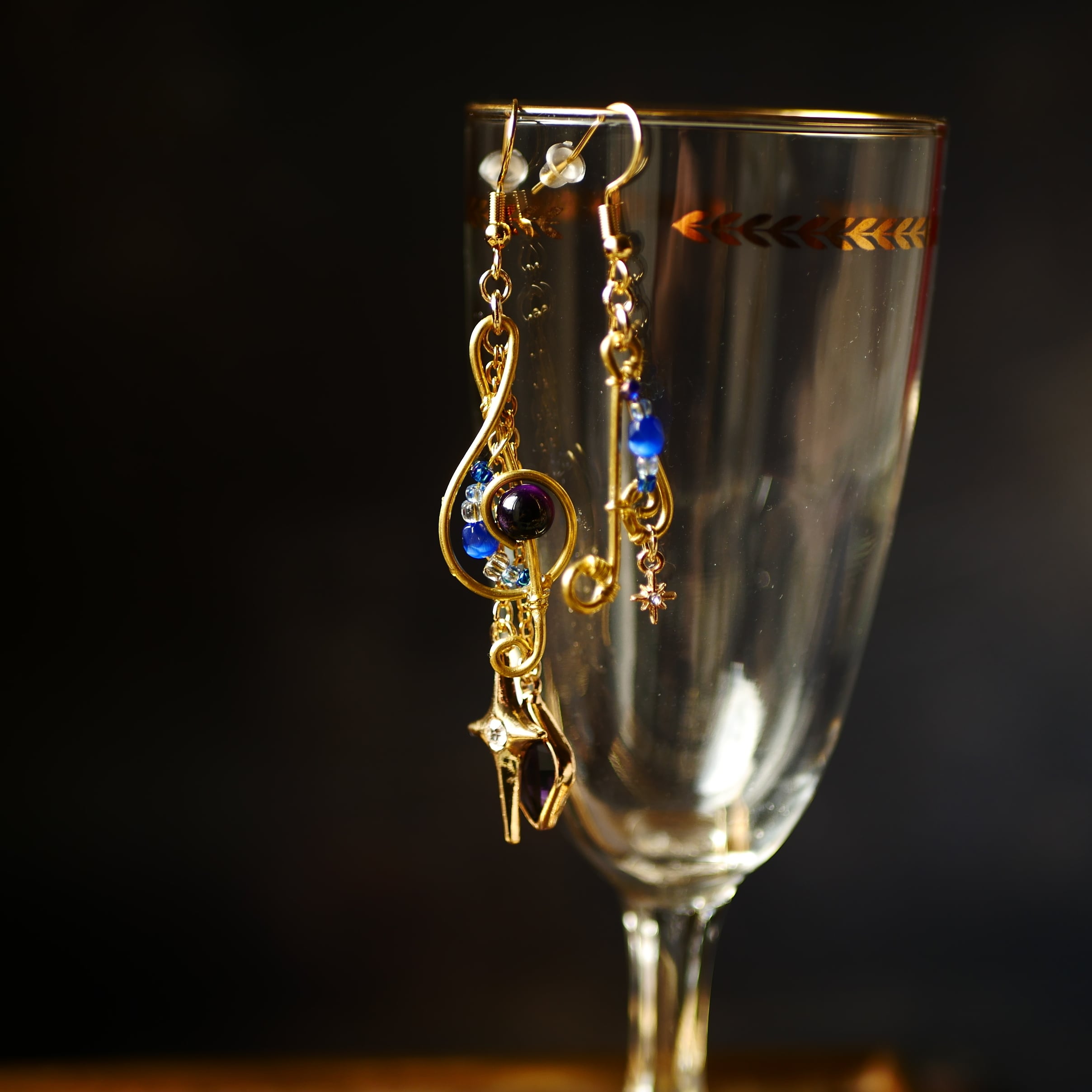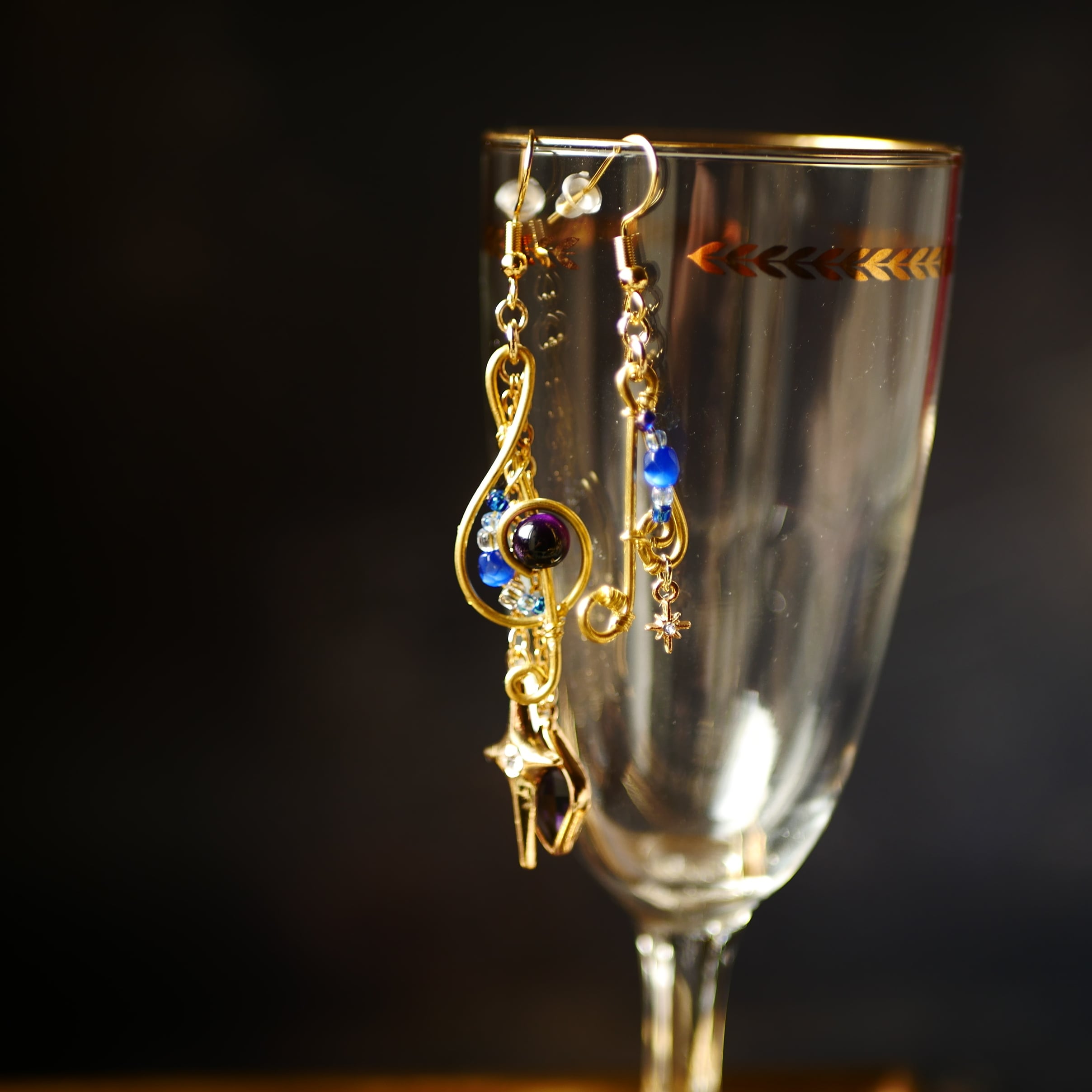 真鍮ワイヤーと天然石、ガラスビーズでデザインした音符の耳飾りです。