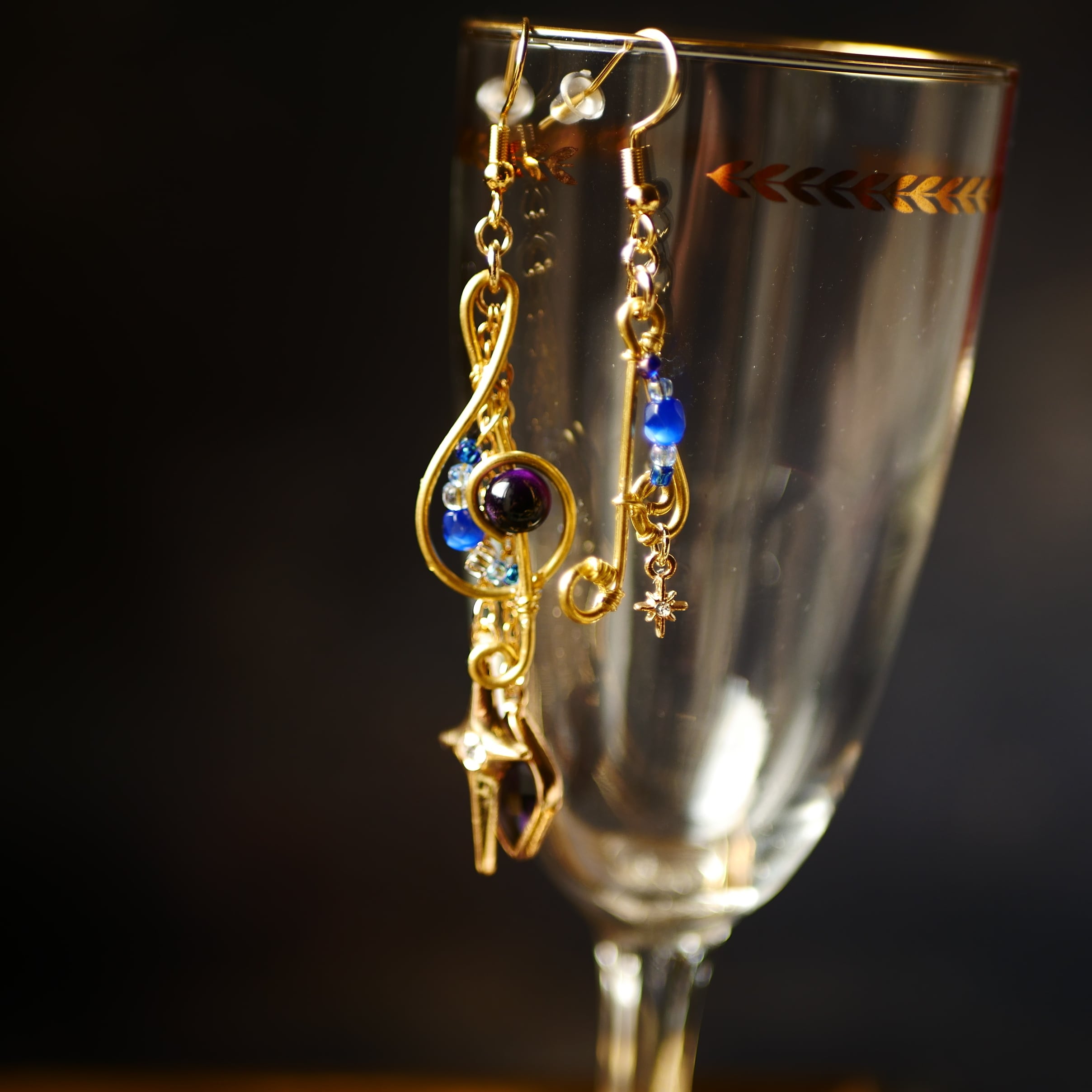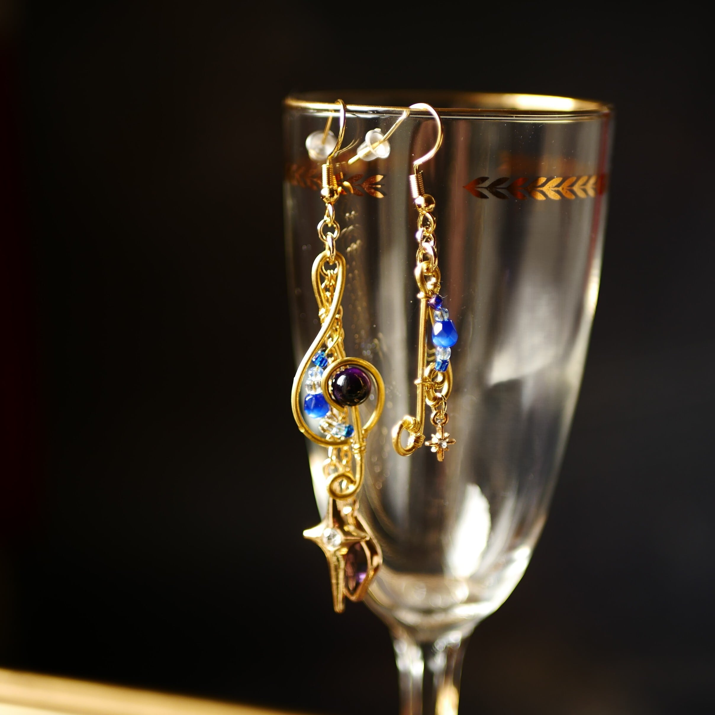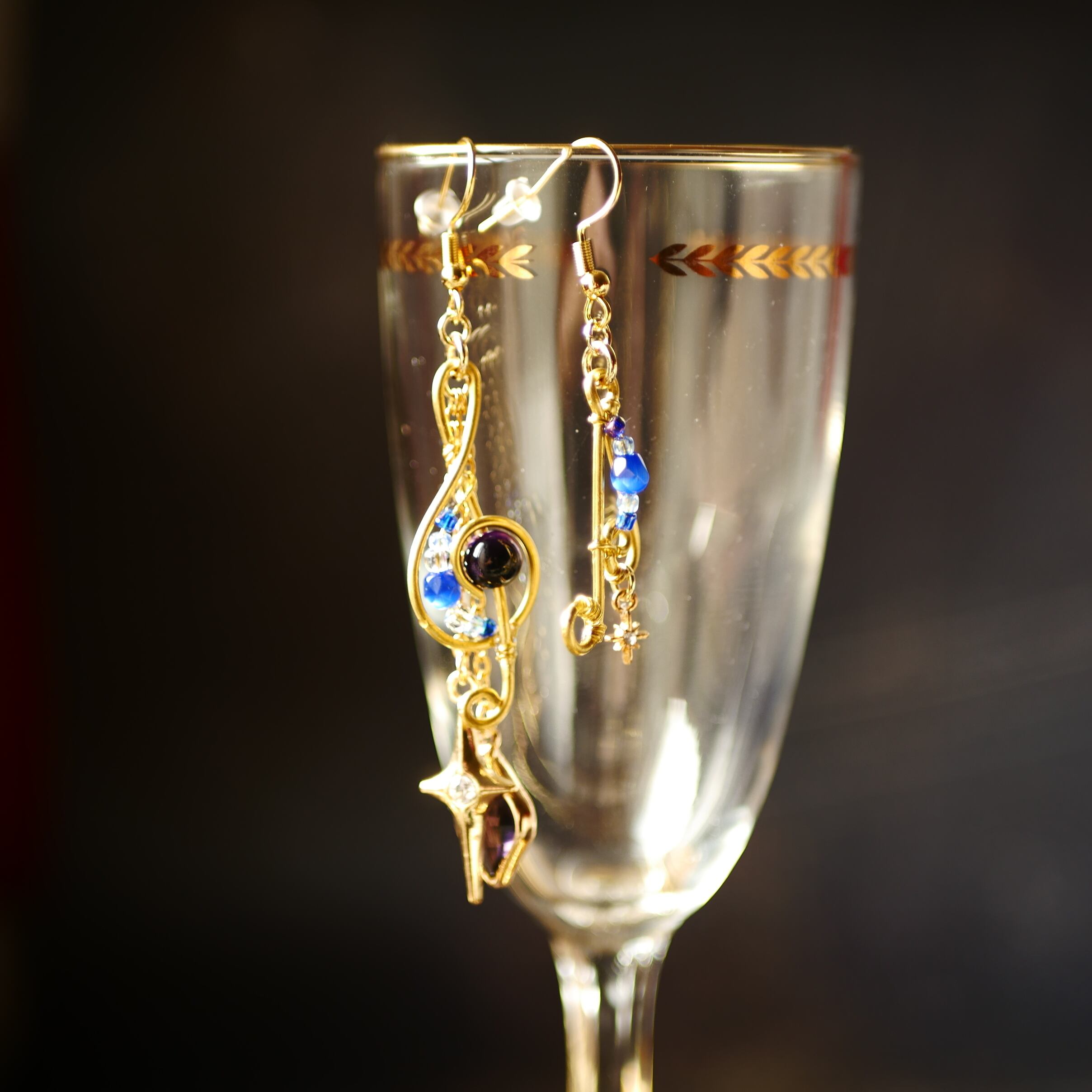 真鍮ワイヤーと天然石、ガラスビーズでデザインした音符の耳飾りです。