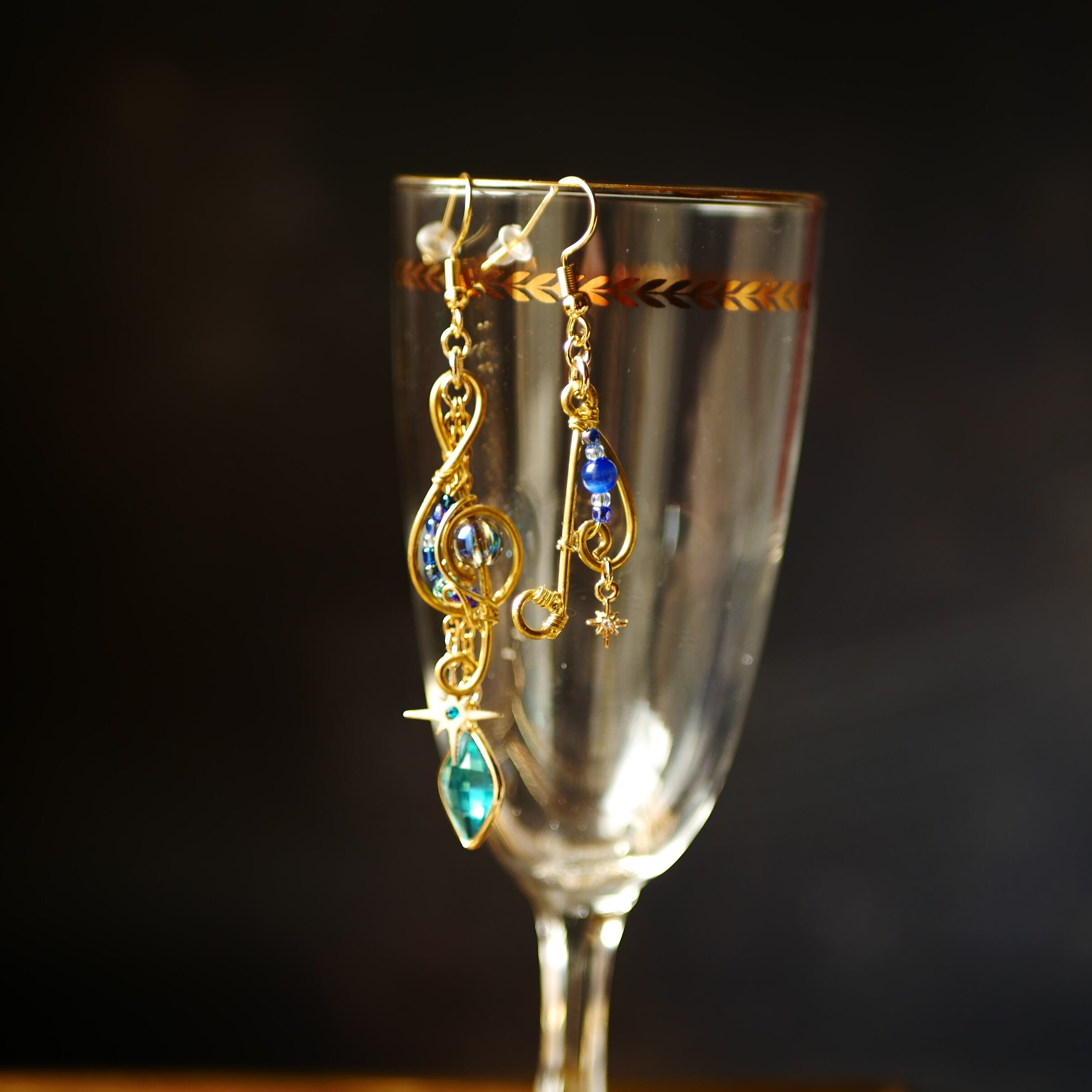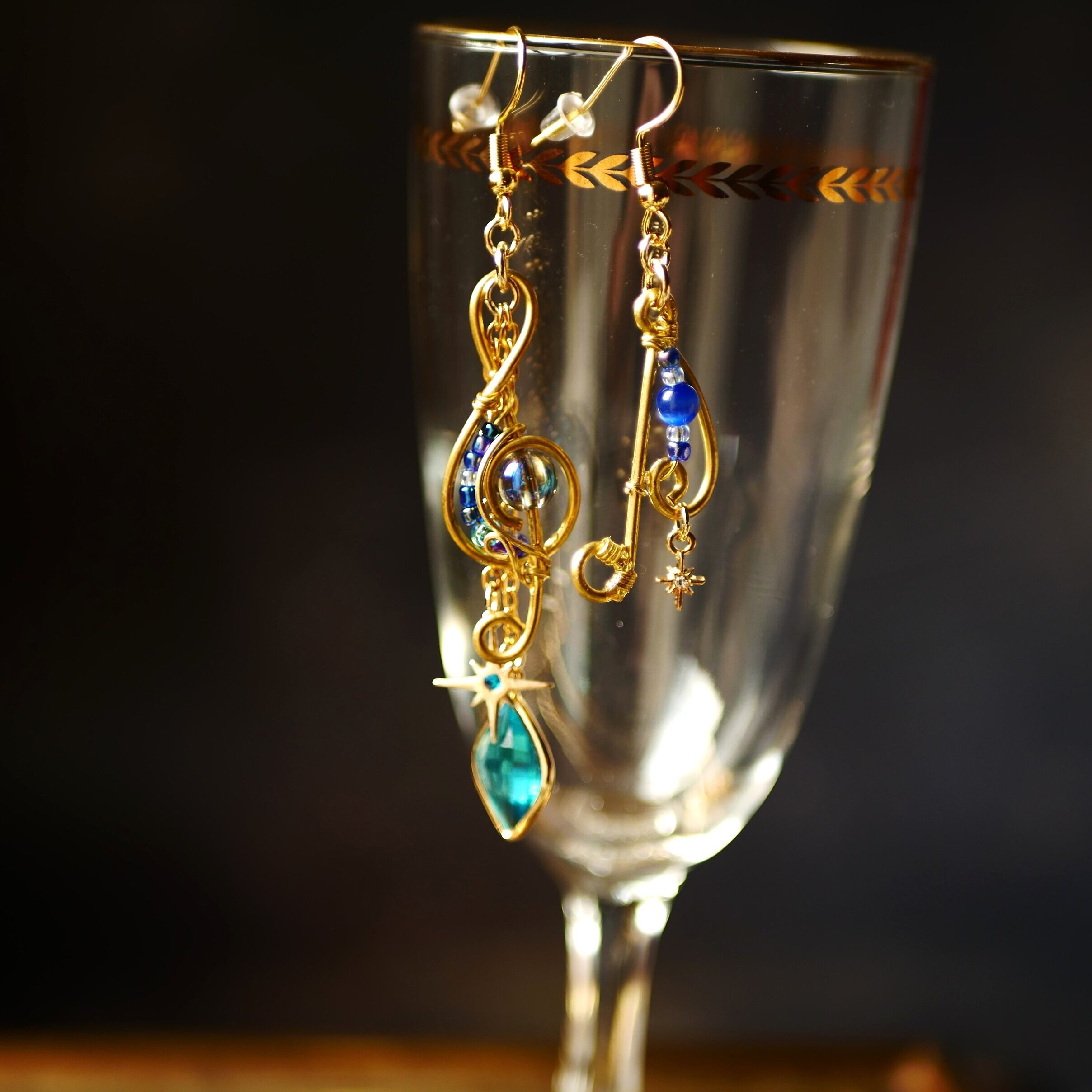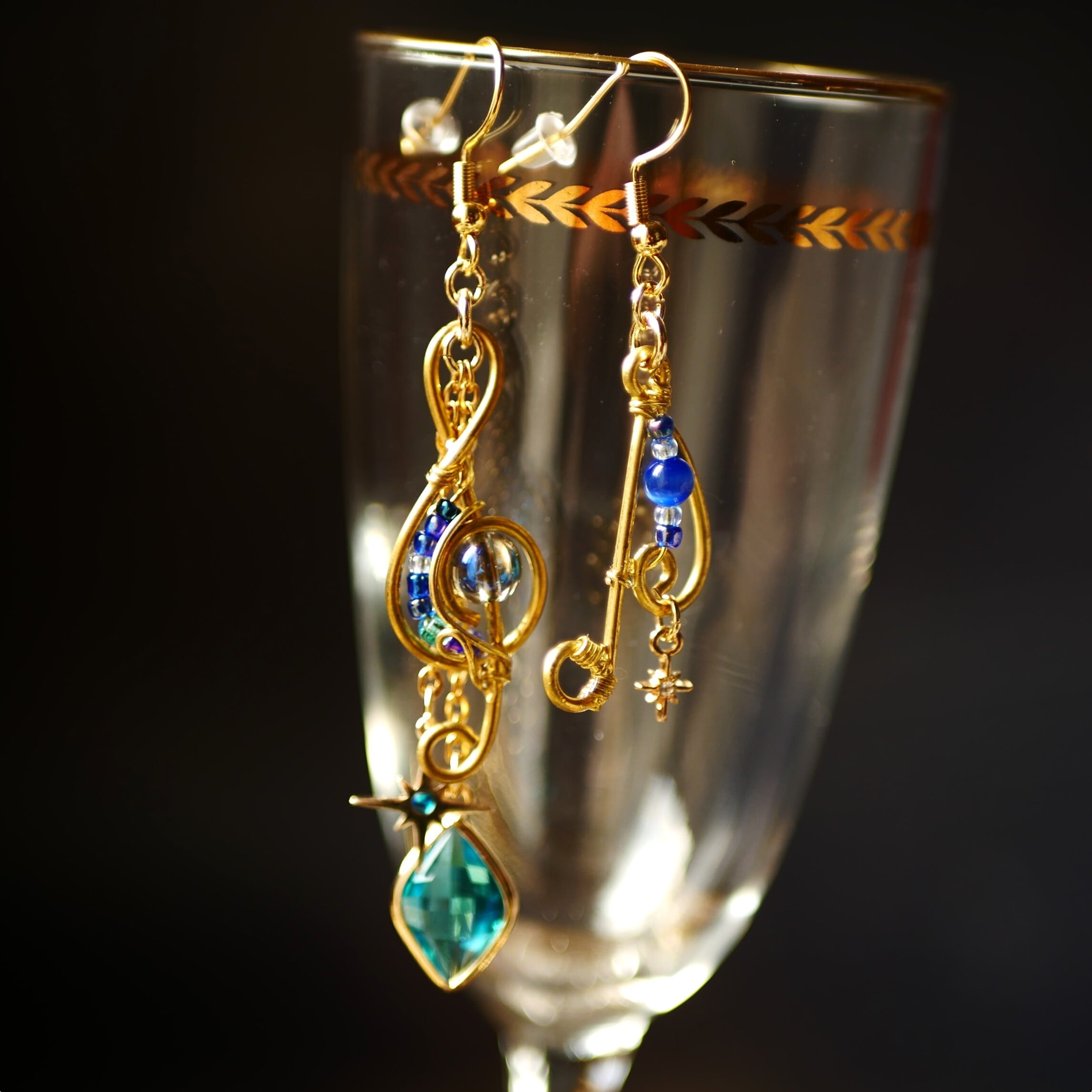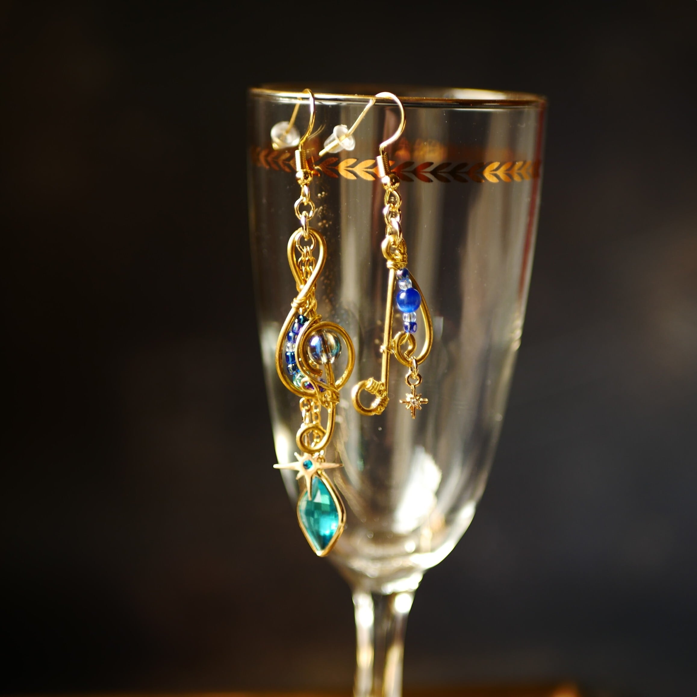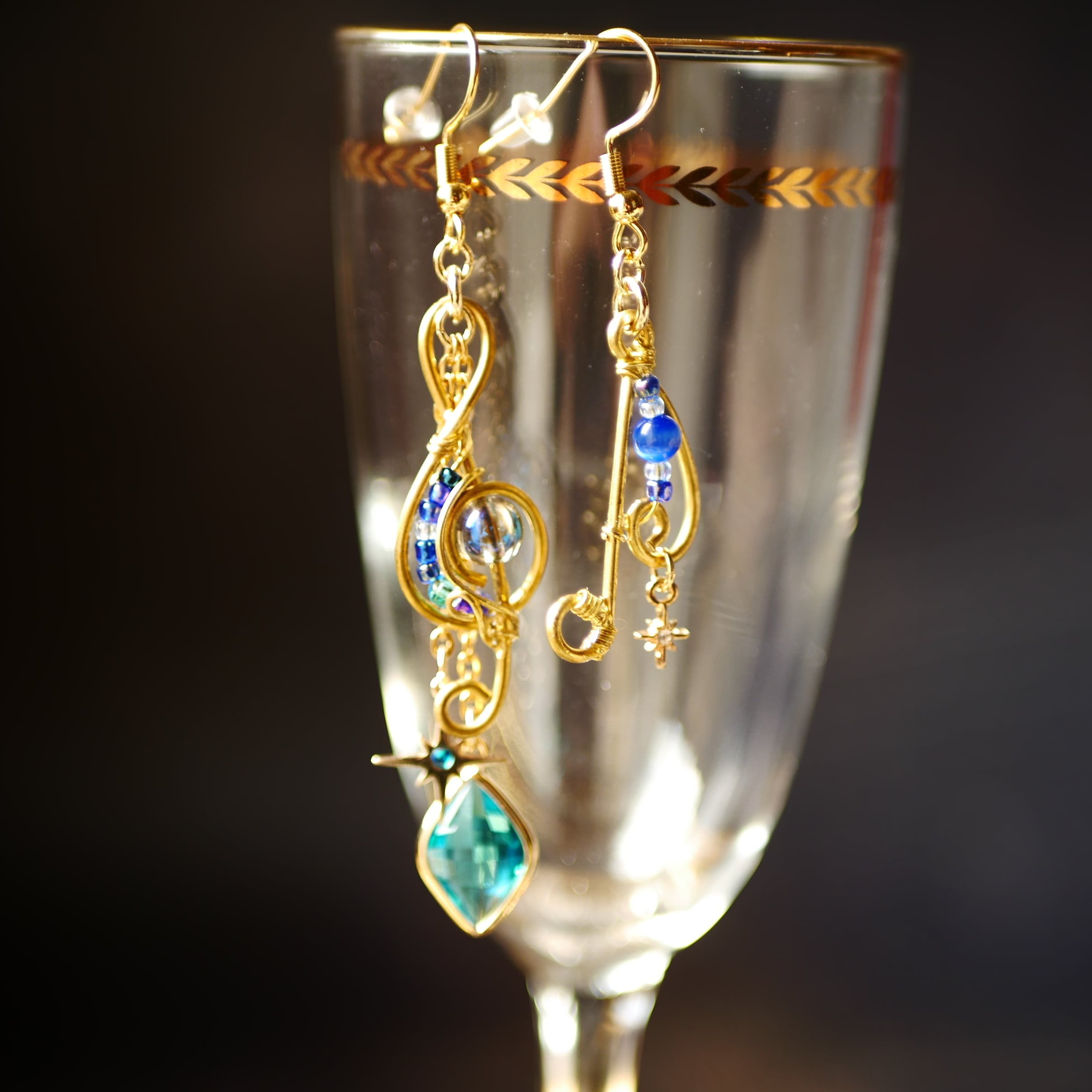 真鍮ワイヤーと天然石、ガラスビーズでデザインした音符の耳飾りです。