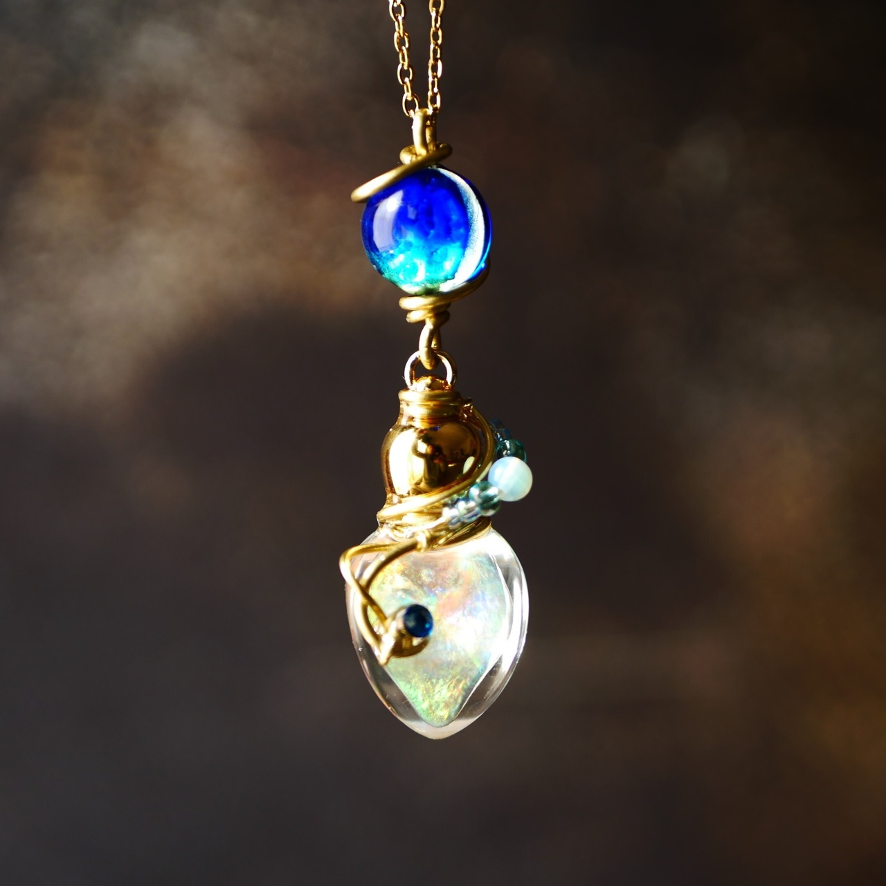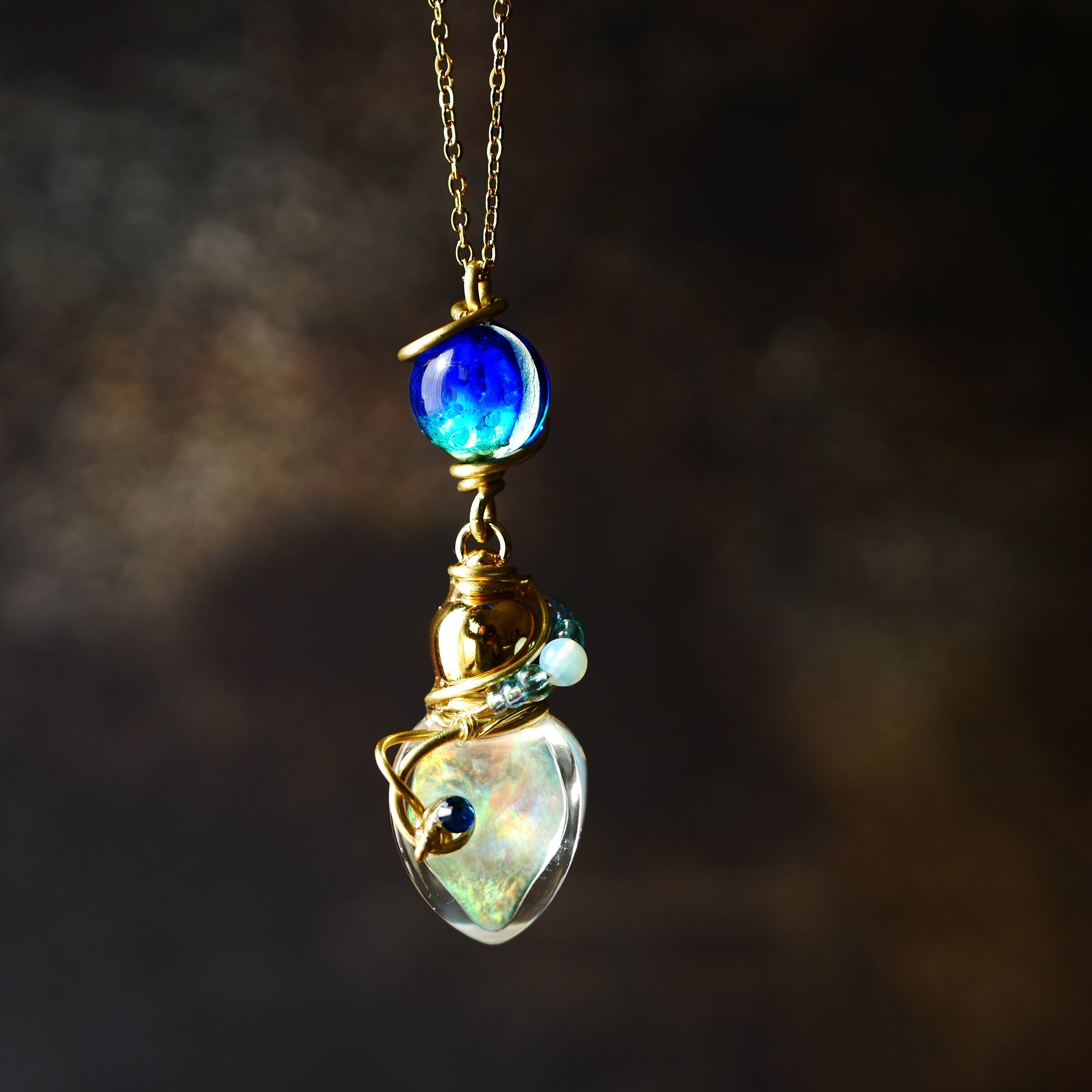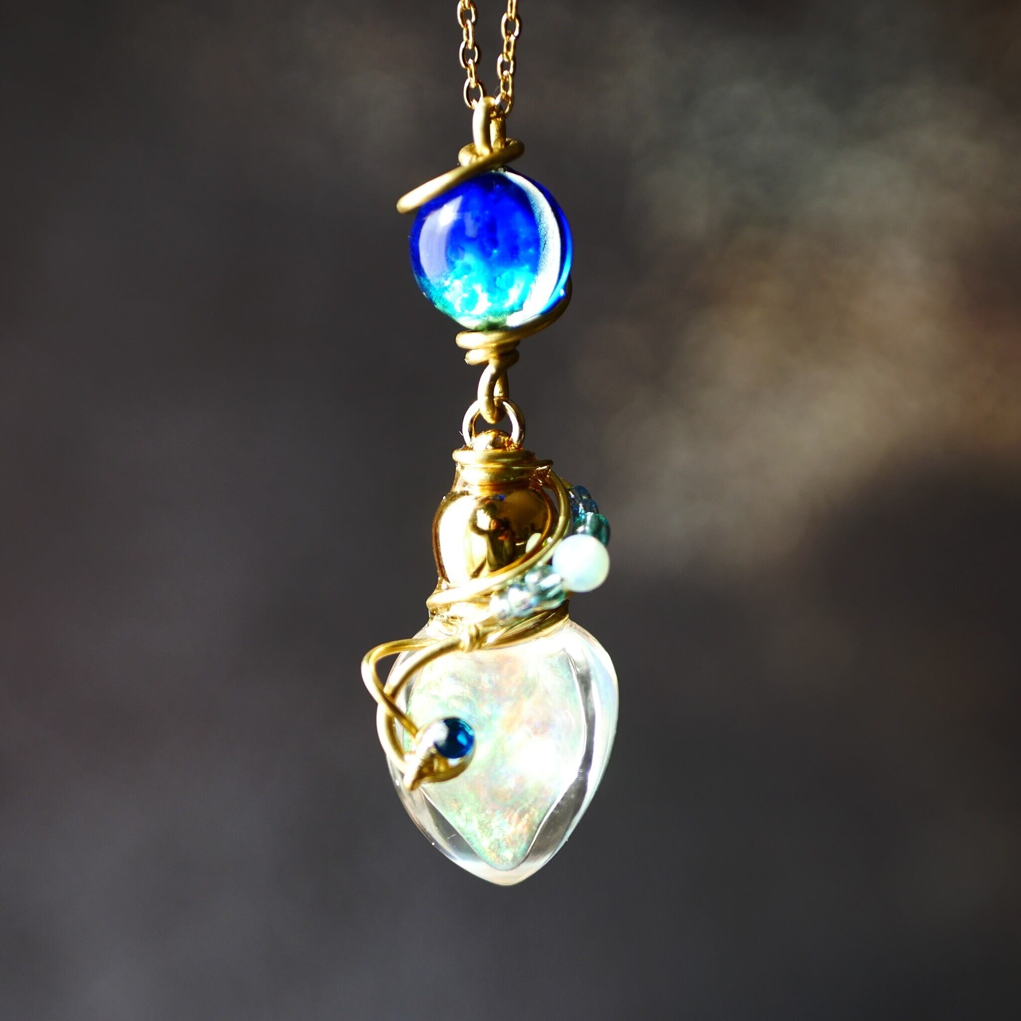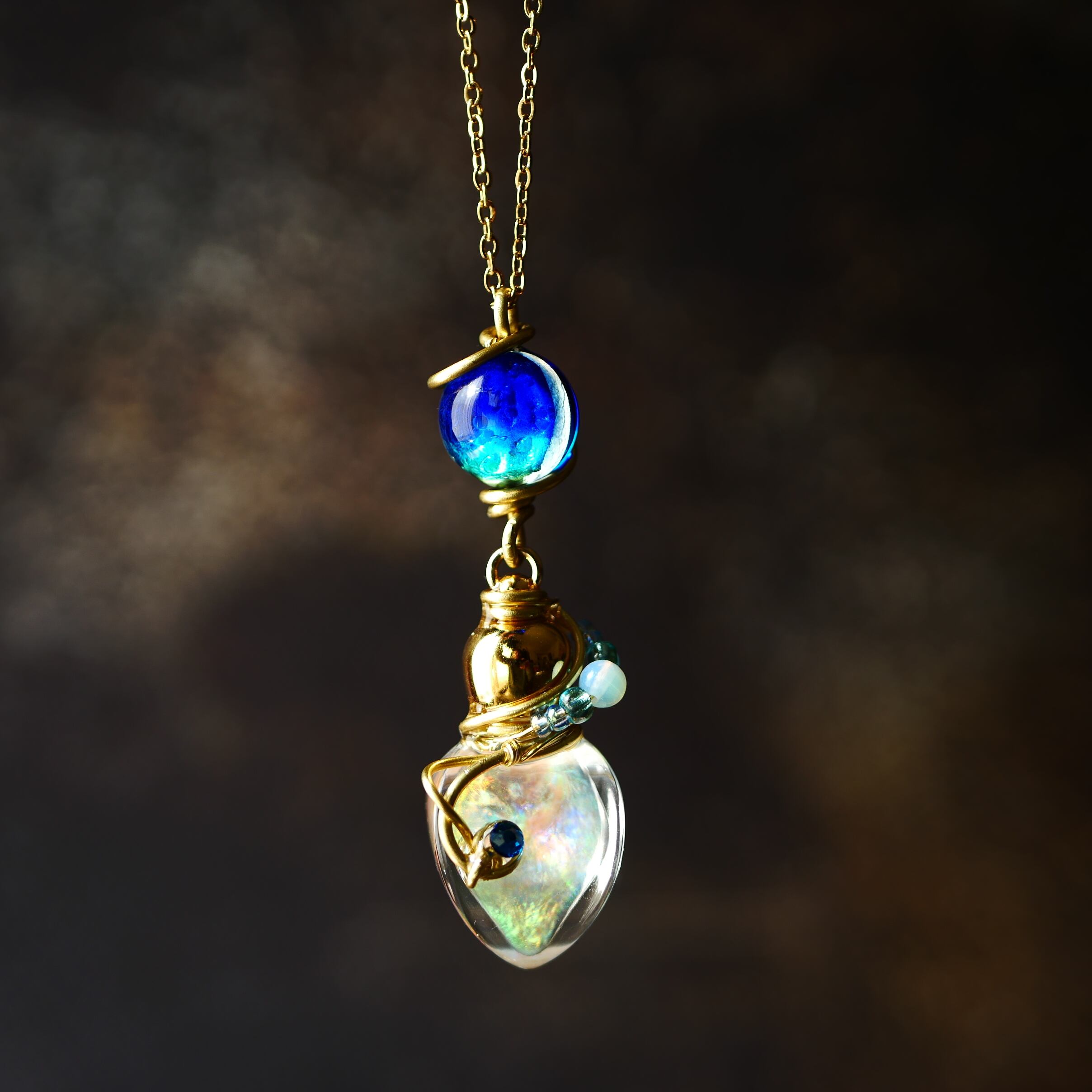 ガラスボトルに虹色に輝く液体(ジェル状)を閉じ込めています。