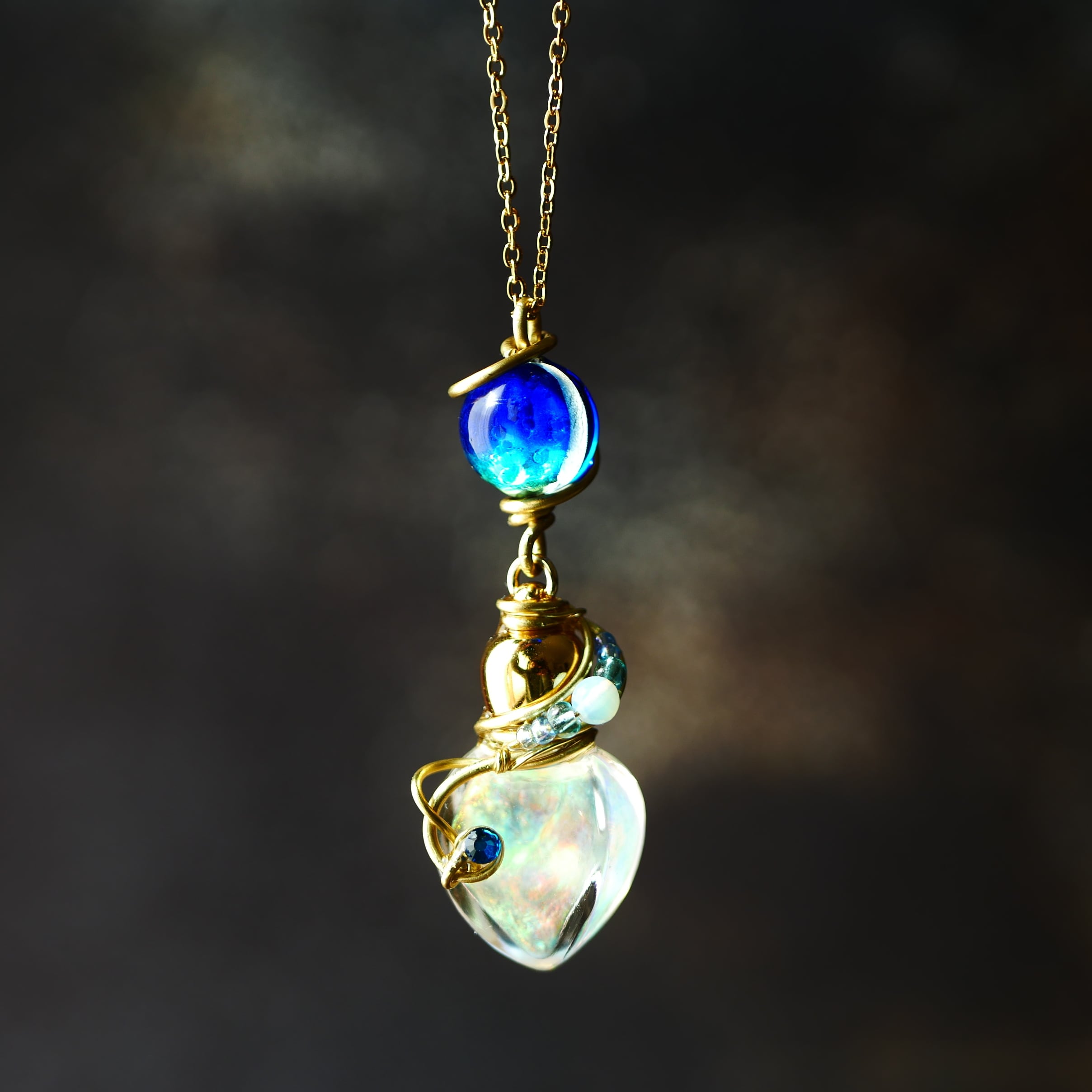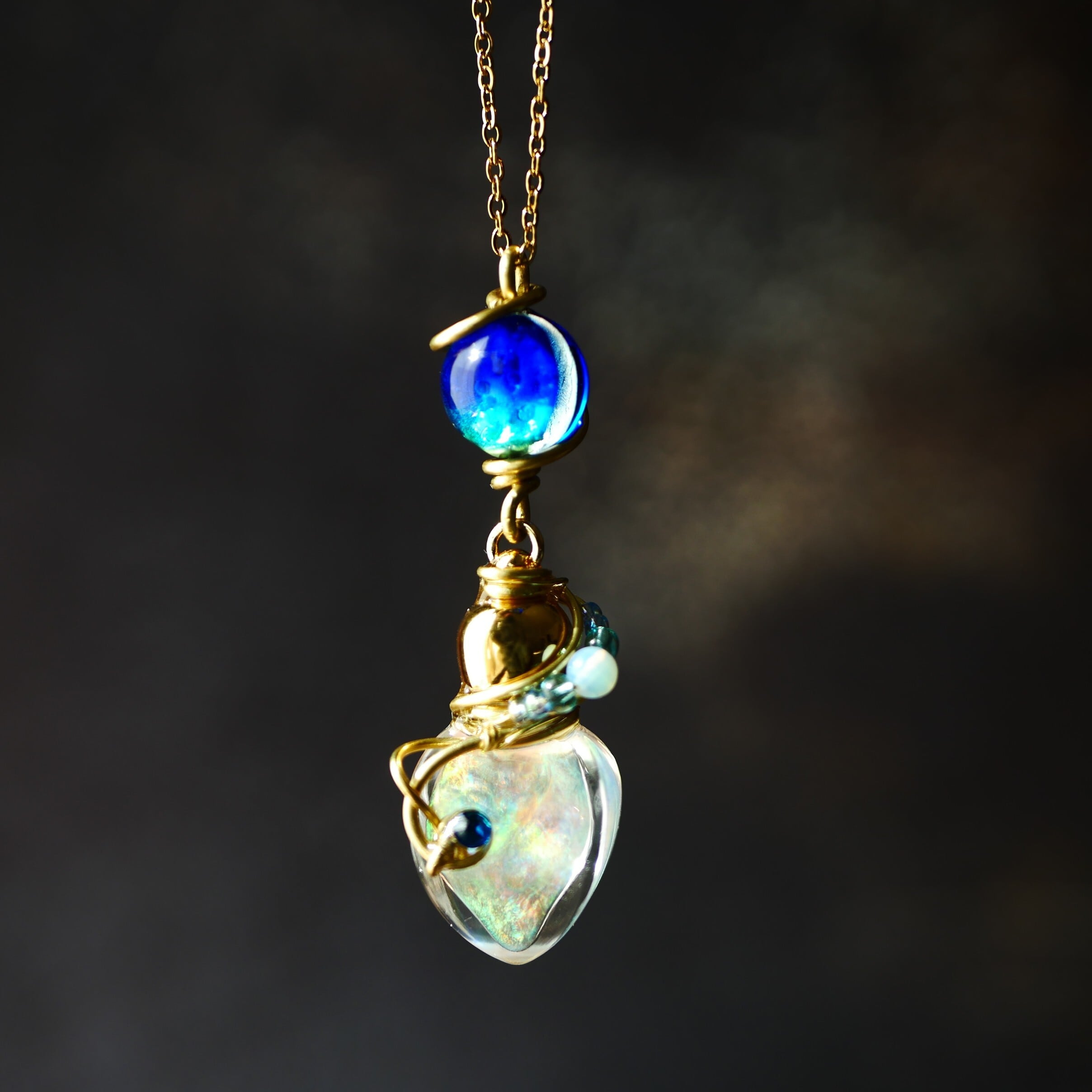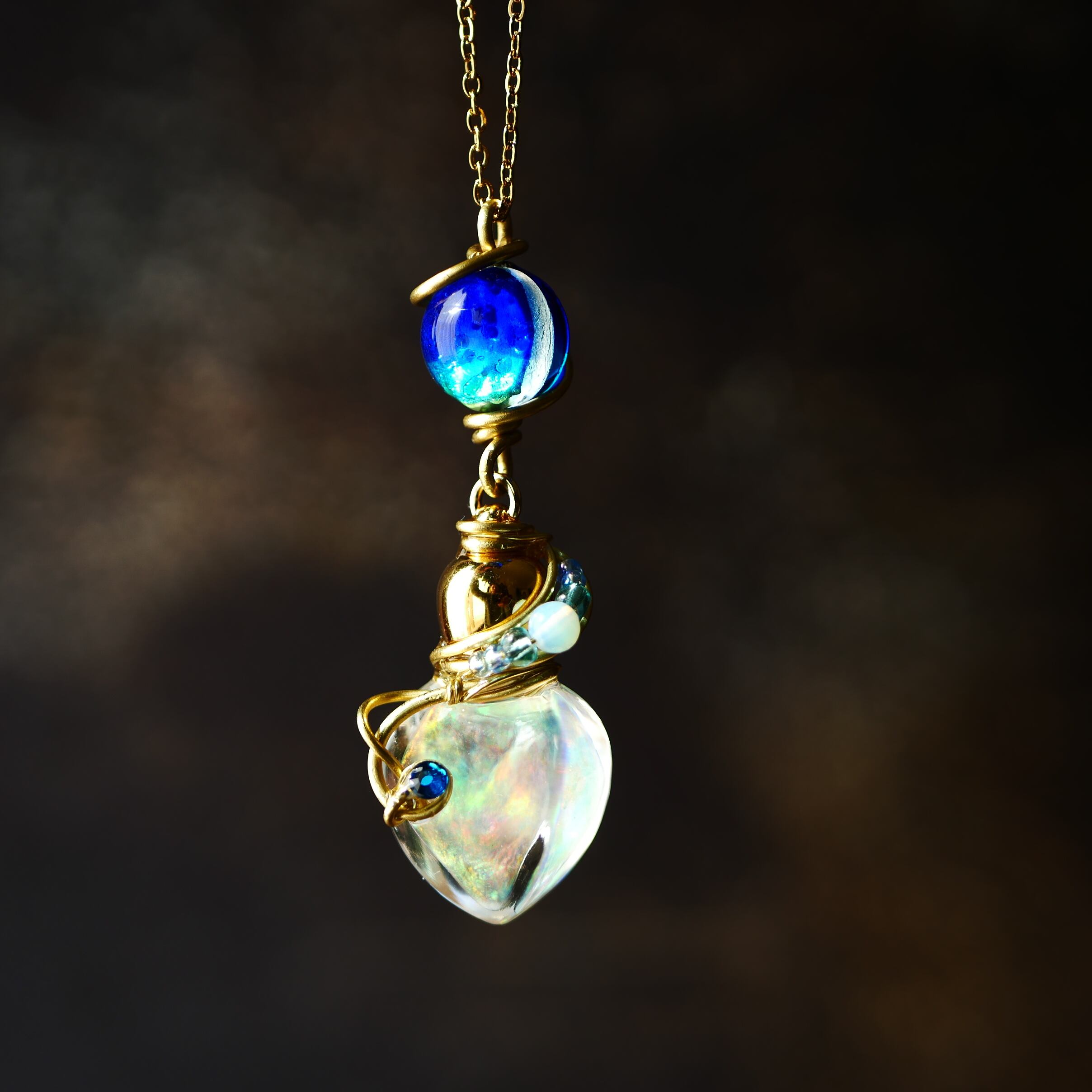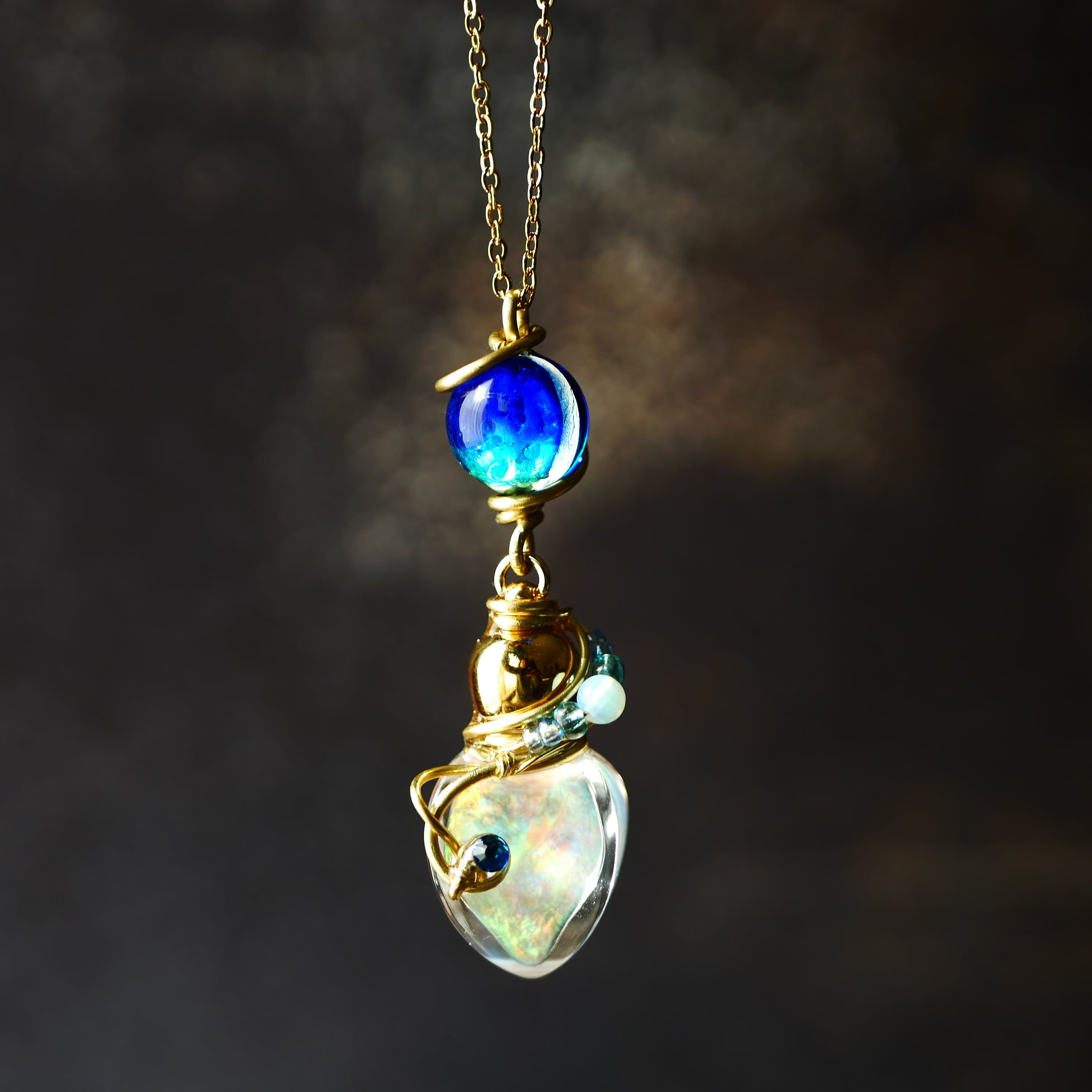 ガラスボトルに虹色に輝く液体(ジェル状)を閉じ込めています。