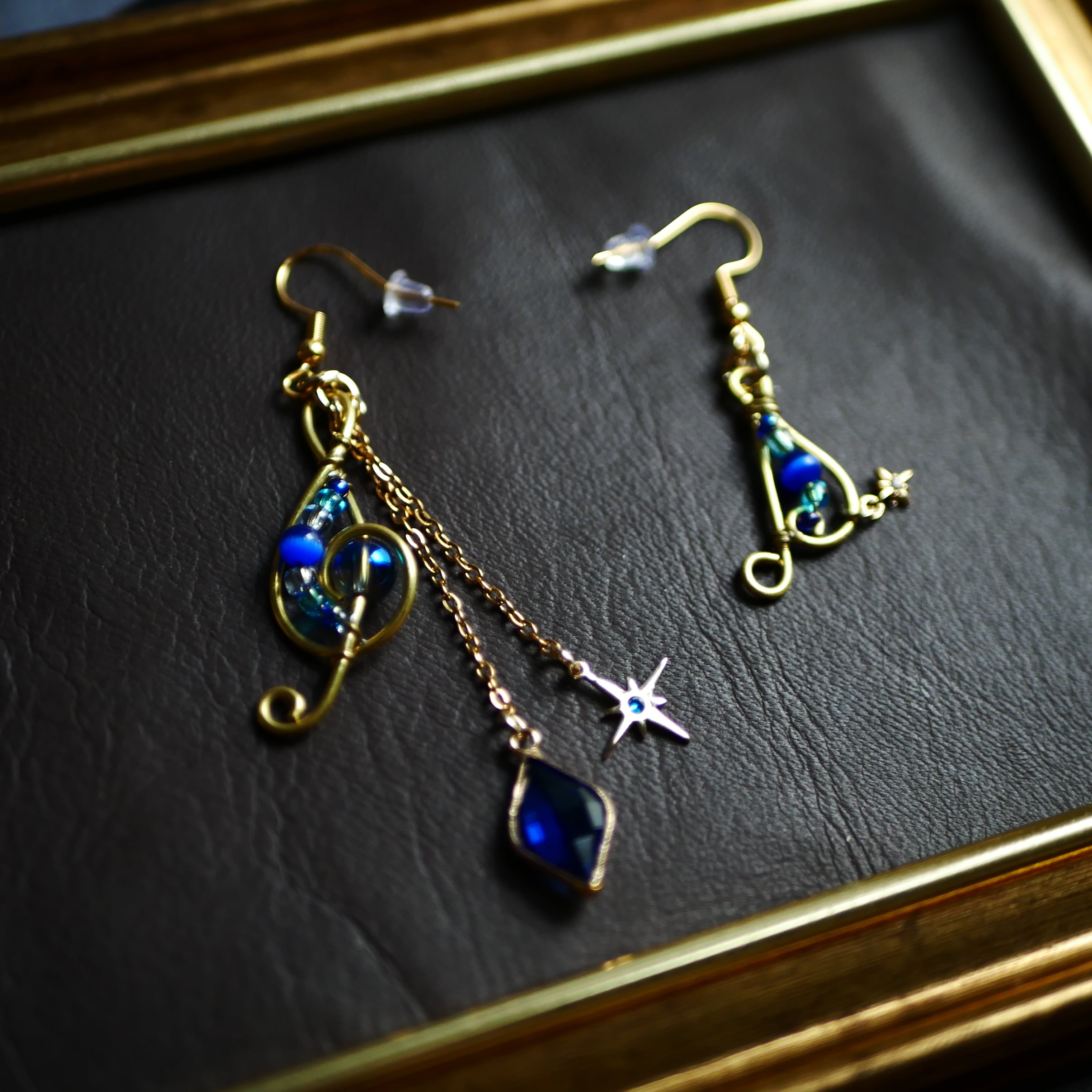 真鍮ワイヤーと天然石、ガラスビーズでデザインした音符の耳飾りです。