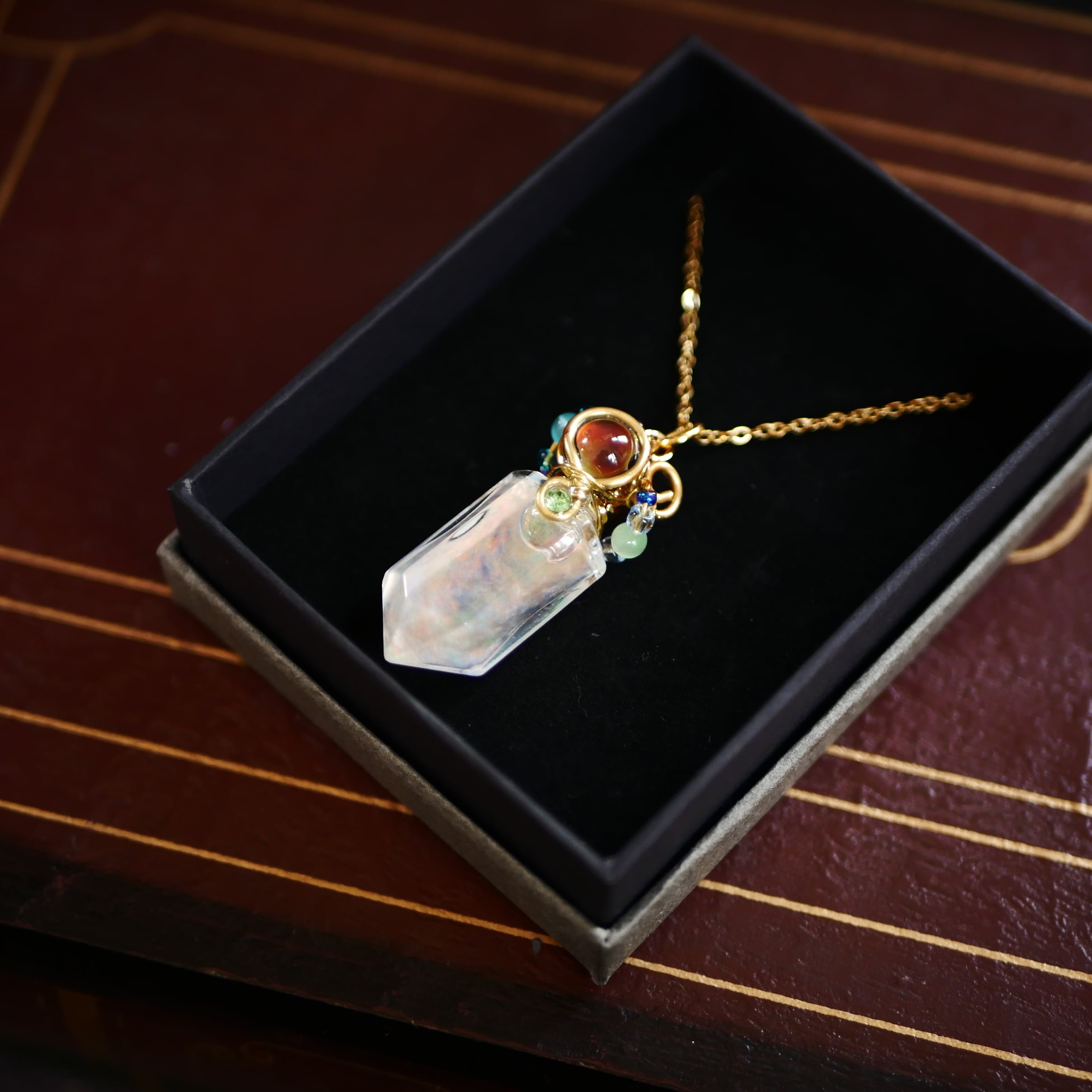 ガラスボトルに虹色に輝く液体(ジェル状)を閉じ込めています。