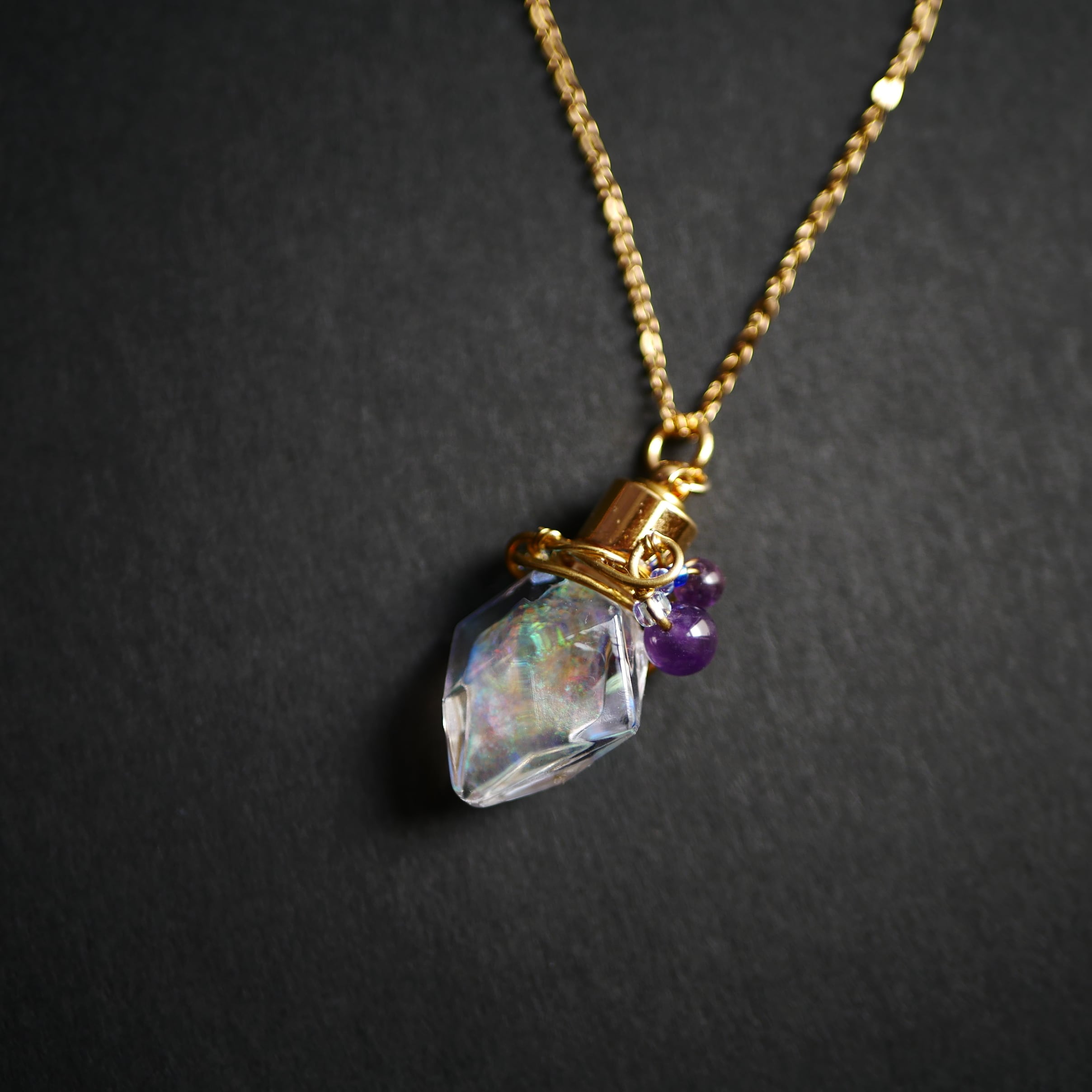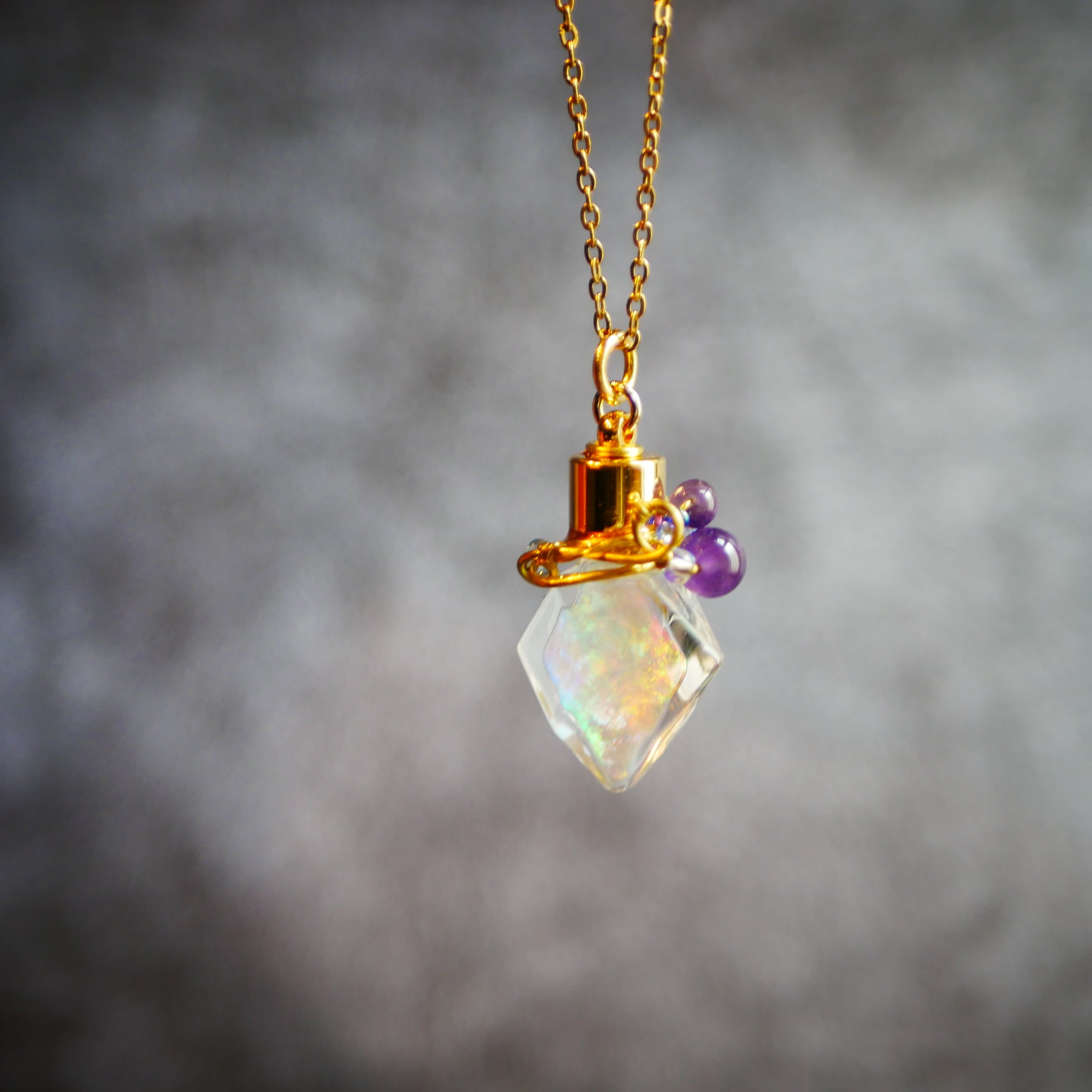 ガラスボトルに虹色に輝く液体(ジェル状)を閉じ込めています。