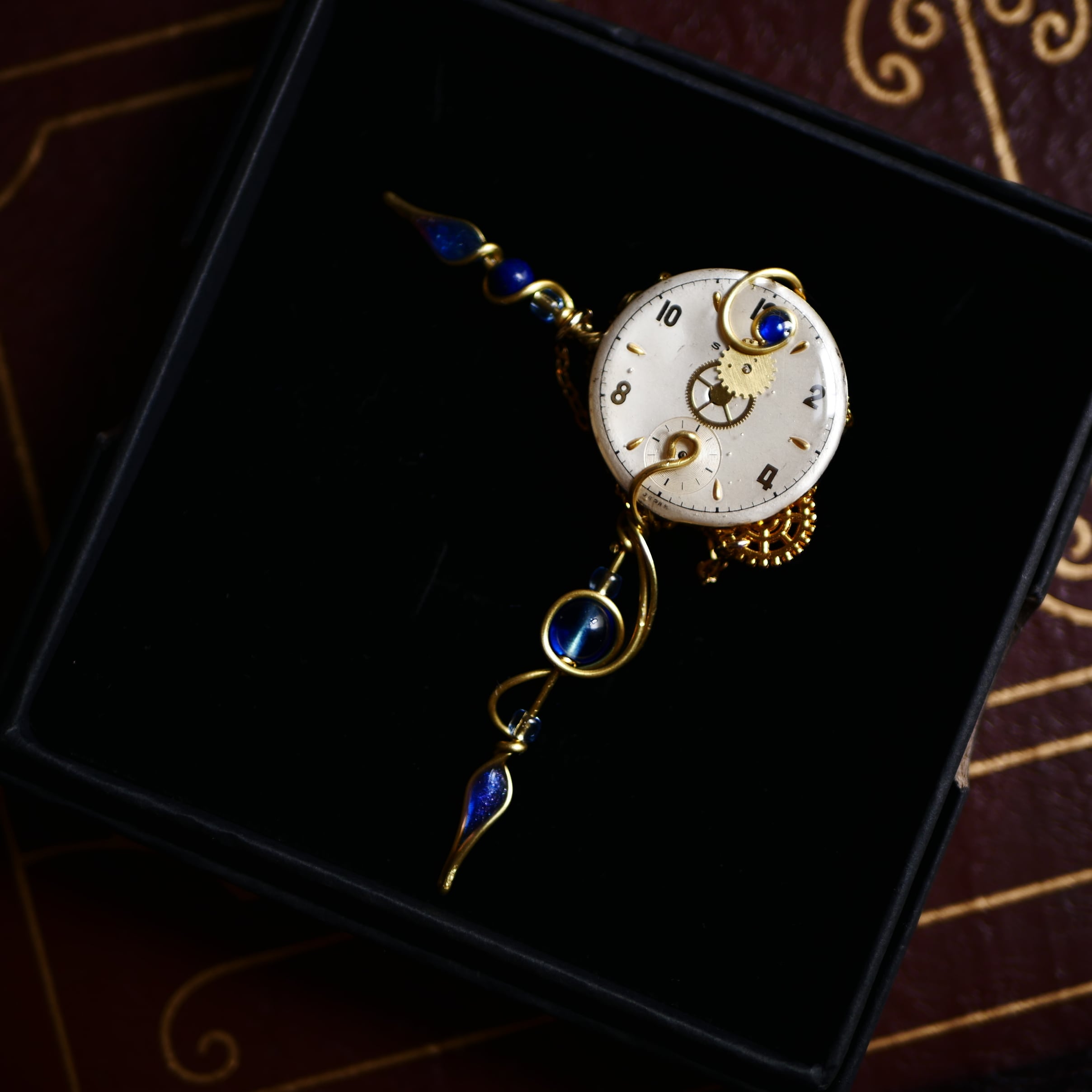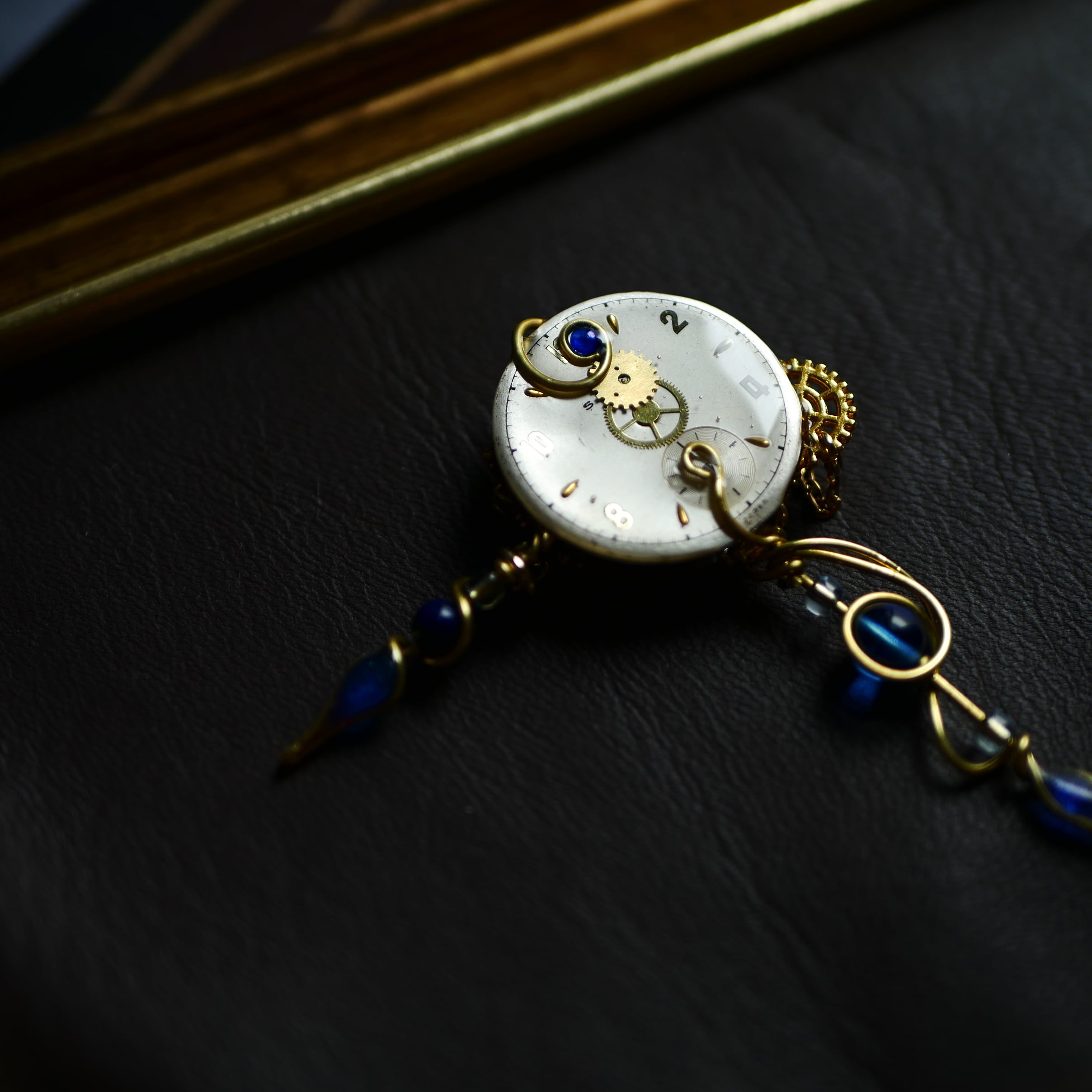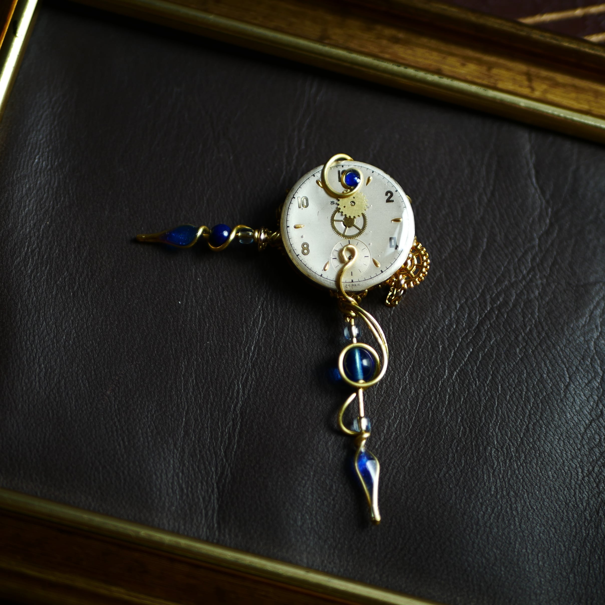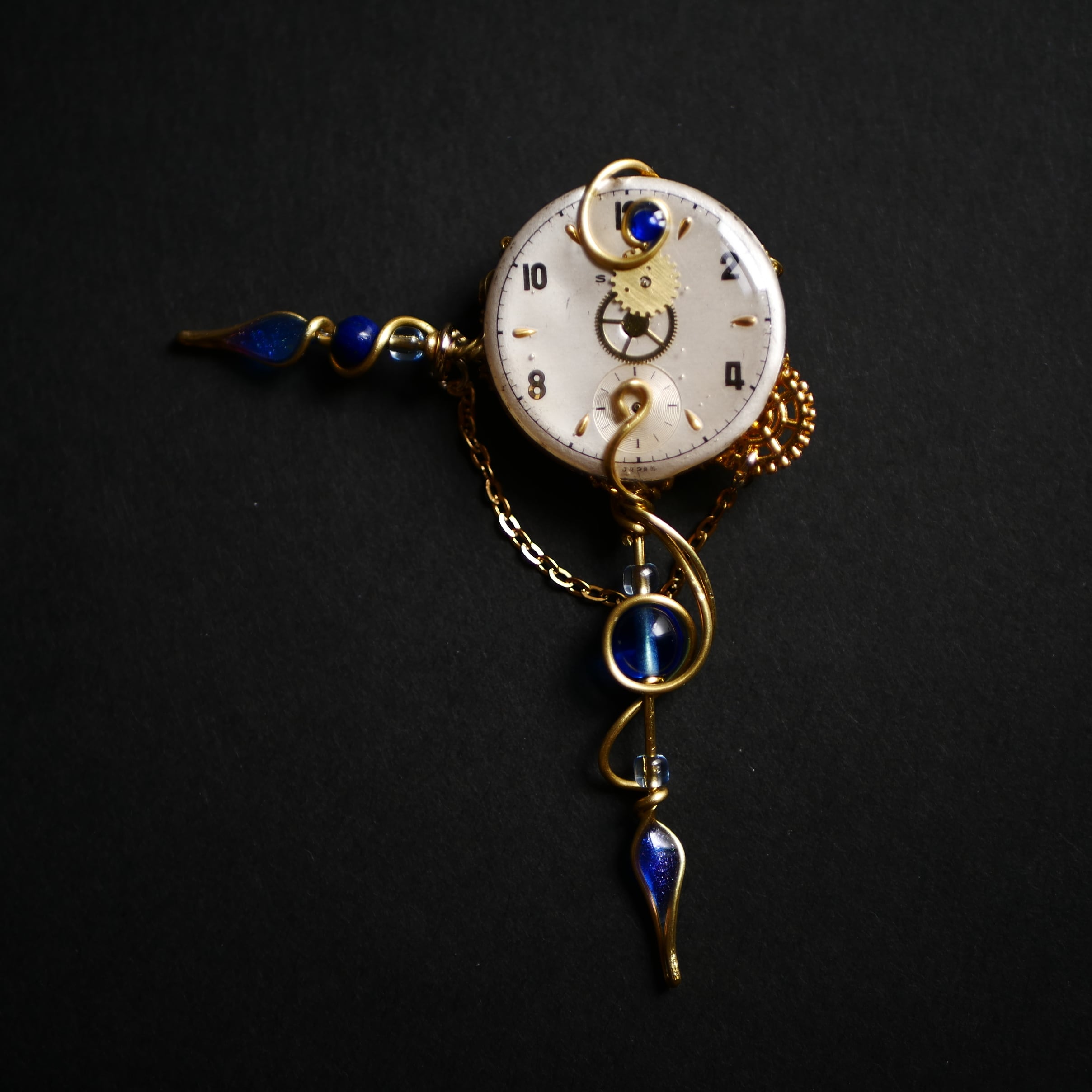 ブローチピンのパーツをベースにサークルフレーム、双針、時計部品(文字盤)、すべて真鍮ワイヤーで編みこみ固定しています。